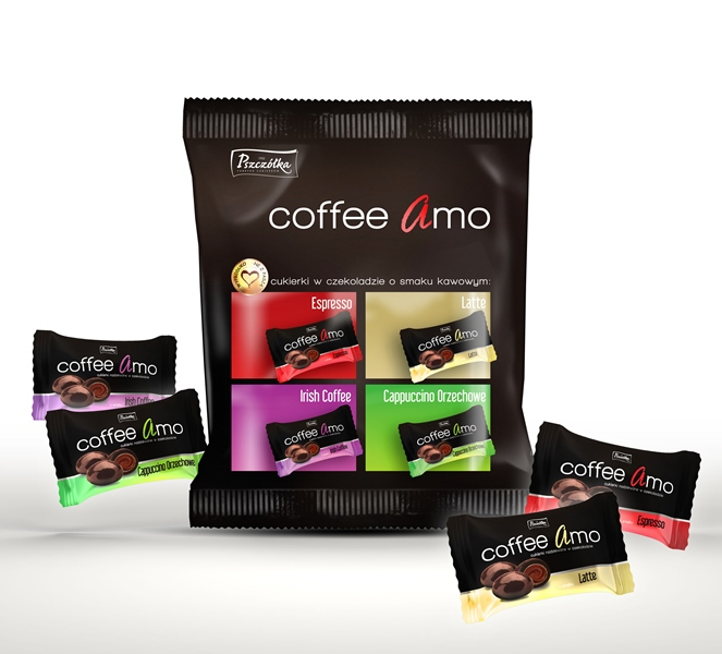 Coffee Amo to karmelki w czterech smakach. Odnajdziemy tu mocne Espresso, mleczne Latte, aromatyczne Cappuccino Orzechowe oraz coś dla dorosłych o smaku Irish Coffee.