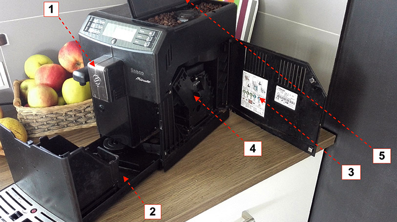 [ZDJĘCIE 2] 1) Podnieś dozownik naparu do góry. 2) Wysuń tacę ociekacza. 3) Otwórz boczną pokrywę obudowy. 4) Wyjmij moduł parzenia, następnie wymyj pod bieżącą wodą i w razie konieczności nasmaruj elementy ruchome, zgodnie z instrukcją obsługi. 5) Podnieś pokrywę zasobnika na ziarna kawy, żeby jej nie uszkodzić podczas przepychania lejka.