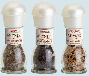 Firma Kotanyi wydała ostatnio serię posypek do kawy i deserów w poręcznym gotowym do użycia młynku: Cukier Cynamonowy, Karmel i Wanilia oraz Czekoladę - warto wypróbować.