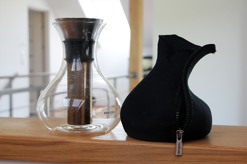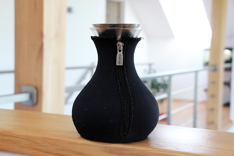 Naczynie ma bardzo ergonomiczny kształt. Można je bezpiecznie chwycić w przewężeniu pod wlewem i łatwo przenieść z miejsca na miejsce. Poza tym, od zewnątrz wykończone jest zdejmowalnym skafanderkiem z suwakiem, który szybko się zdejmuje, np. podczas mycia w zlewie kuchennym lub w zmywarce. „Ubranko” wykonane jest z materiału używanego do produkcji kombinezonów dla nurków, zwanym przez niektórych pianką. Lubię nie tylko praktyczność tego dzbanka ale też jego kształt – jest nieco kobiecy i zwraca na siebie uwagę. Nie raz goście pytali mnie, co to jest i do czego służy.