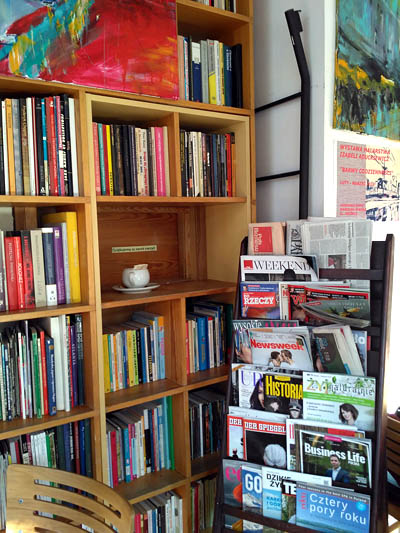 „Kafka” spodoba się wszystkim, którzy lubią otoczenie książek i sztuki. Dzisiaj wiszą tu barwne, kontrastowe obrazy Izabeli Aduckiewicz przedstawiające miejskie krajobrazy. Przytulny, domowy klimat „Kafki” buduje także drewniana, pokrywająca niemal całą ścianę półka z książkami, które można swobodnie czytać. Znajdziemy tu co najmniej kilkaset książek, od powieści podróżniczych, po przewodniki po Warszawie, publicystykę, atlasy sztuki i książki dla dzieci. Są też bieżące numery czasopism i dzienników. Jeśli nie chcemy rozstawać się ze znalezioną książką, można ją kupić... na wagę. Na parapecie przy barze stoi stara sklepowa waga, która pomoże w wycenie. Dochód z książek zasila napiwki dla obsługi.