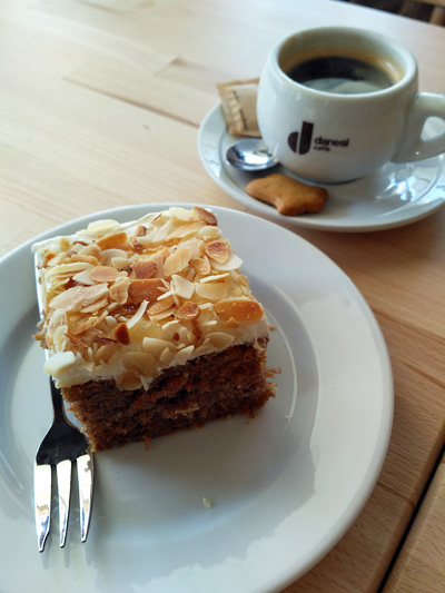 „Kafka” oferuje kilka świeżych ciast do wyboru, z reguły jedno kremowe, marchewkowe oraz jakiś rodzaj sernika, np. z bezą i brzoskwiniami. Dzisiaj mój wybór padł na ciasto marchewkowe ze śmietanką i płatkami migdałów. Był całkowicie trafiony! Ciasto, w solidnej porcji, jest świeże, nie za słodkie, pachnące i przypominające smakiem piernik. To pewnie zasługa przypraw tradycyjnie dodawanych do słodkich wypieków z marchewką. W menu kawiarni znajdziemy także sałatki, makarony, oraz naleśniki słodkie i wytrawne. Od poniedziałku do piątku od godz. 12 można zjeść tu także lekki i zdrowy lunch złożony z zupy i drugiego dania. "Kafka" ma w ofercie szeroki wybór herbat, serwuje czekolady oraz świeżo wyciskane soki. Jest to też propozycja na spotkanie po pracy czy wieczorne wyjście - znajdziemy tu naprawdę sporo rodzajów cydru i wina.