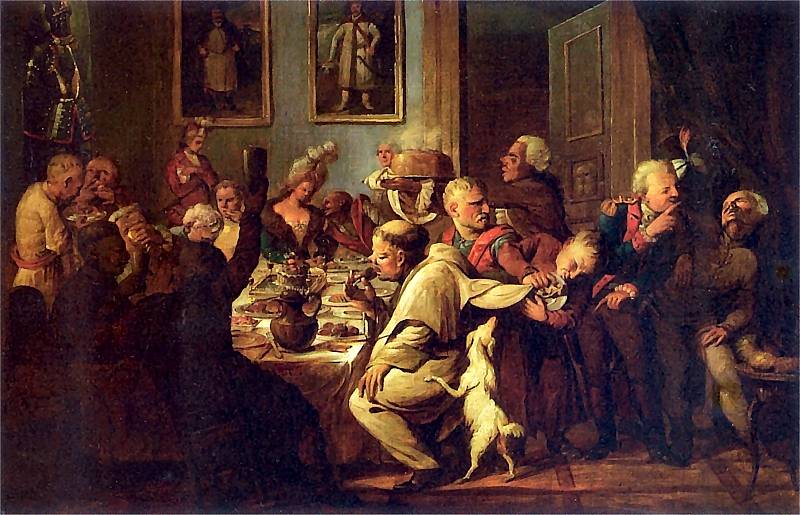 Obraz olejny „Uczta u Radziwiłłów” pędzla Aleksandra Ostrowskiego, datowany na pierwszą połowę XIX wieku.