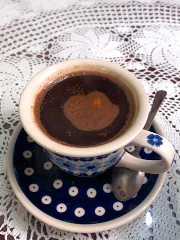 Ta ostatnia to parzona w tygielku mieszanina ziaren kawowca, cynamonu, kardamonu oraz brązowego cukru. Kawy z cukrem z reguły nie pijam ale tutaj warto było to zrobić. Jeżeli nie macie w okolicy miejsca, w którym tak doskonale ją przyrządzają, śpieszę podać przepis do samodzielnego wykonania w domu.