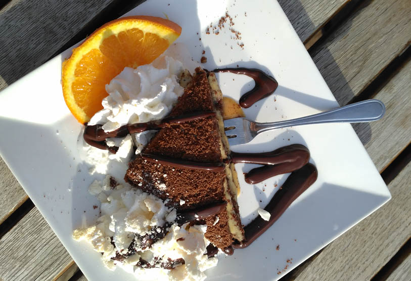 Wnętrze kawiarni „Pokusa” zwraca uwagę przytulnym wystrojem. Jest dużo jasnego drewna, kwiatowych zdobień i dużo światła. Miękkie fotele wyglądają bardzo zachęcająco. Za barem pracuje zwykle kilka osób, co podnosi szybkość i jakość obsługi. Zaglądając do uroczego menu, oprawionego w drewno, szybko decyduję, że do mojego niedzielnego zestawu: góry-słońce-kawa, dołączy ciasto. Mój wybór pada na marlenkę z bitą śmietaną, sosem czekoladowym i świeżą pomarańczą. Porcja jest solidna i wygląda wspaniale. Powróciwszy na taras, przekonuję się, że smakuje nawet lepiej niż wygląda!
