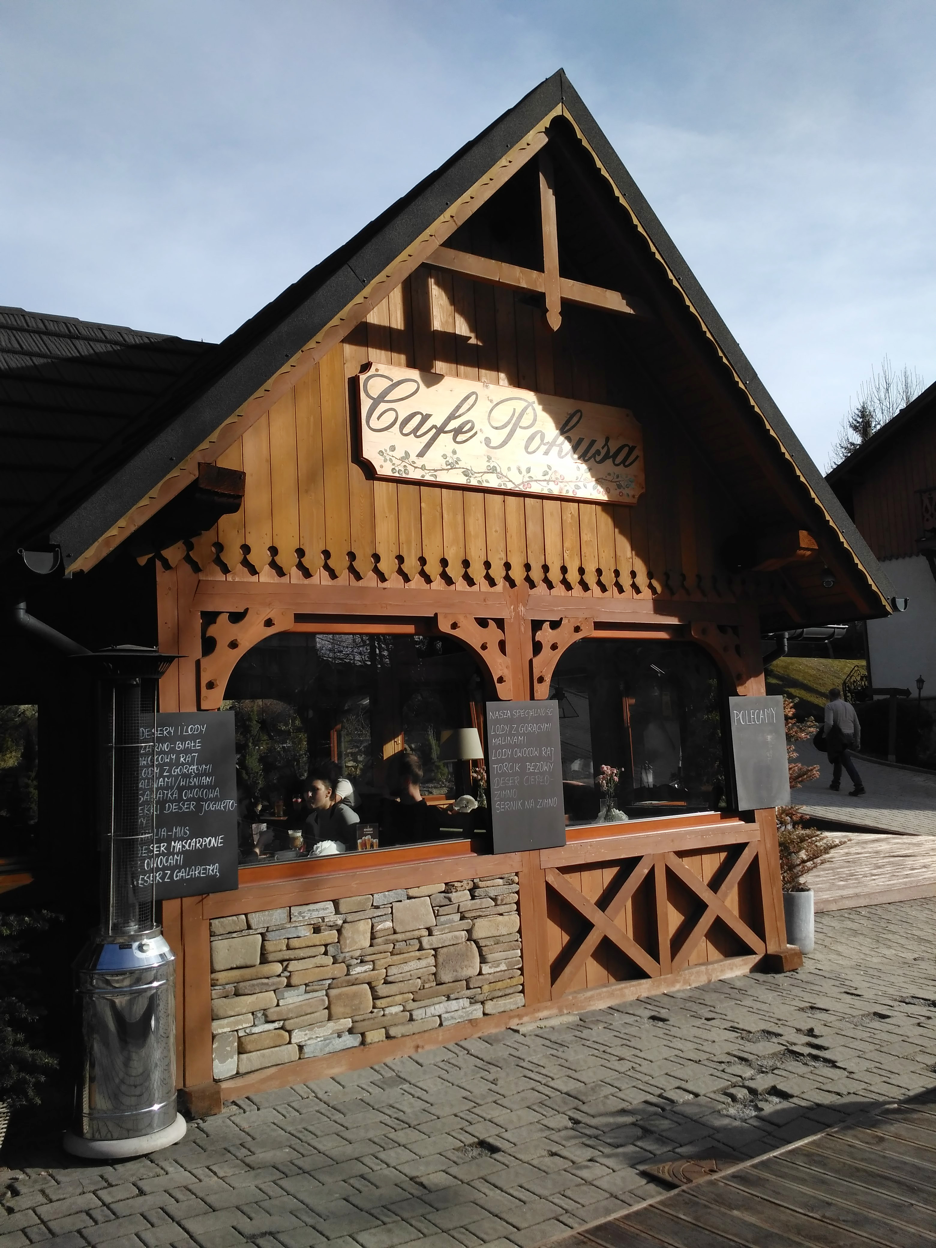 To był wyjątkowo ciepły dzień, bez jednej chmury na niebie. Przyjechałam do Szczawnicy popołudniu, ale mimo to, zdążyłam jeszcze wyruszyć na krótki spacer w góry. Wybrałam godzinny szlak do schroniska PTTK Bereśnik, który okazał się naprawdę zjawiskowy – przez znaczną część trasy towarzyszył mi widok na Tatry. Tak wyraźny, że można je było malować! Po dniu w ostrym słońcu dopadło mnie w końcu zmęczenie – po zejściu ze szlaku zaczęłam szukać kawiarni w centrum Szczawnicy, gdzie można zjeść coś słodkiego i napić się kawy. W marcu w Szczawnicy jest jeszcze spokojnie, sezon turystyczny rozkręca się dopiero w kwietniu. Spacerując po centrum w niedzielne popołudnie, ciężko było znaleźć jakąkolwiek otwartą kawiarnię. Na szczęście skręcając nieco pod górę, w stronę uzdrowiska, natrafiłam na drewniany domek z tarasem w pełnym słońcu. Mieści się w nim kawiarnia „Pokusa”, a zaraz obok niej restauracja i pensjonat o tej samej nazwie.