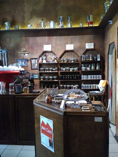 | Fot. 2. Przytulne wnętrze i bar kawiarni | Fot. 3. We wnętrzu znajdziemy dużo obiektów i książek o kawie oraz pocztówek od zadowolonych klientów | |||