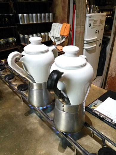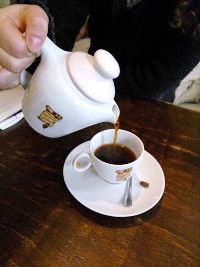 I już po chwili na moim stoliku znajduje się kawiarka oraz mała filiżanka z ziarnem kawy, której zaraz spróbuję. Kawa z Peru posmakowała mi bardziej ze względu na niską kwasowość, łagodny, nieco czekoladowy smak, idealny na poranek. Ciemno palona meksykańska kawa przypadnie do gustu, jeśli szukamy wyrazistego, mocnego smaku. Dla mnie była trochę za mocna i ziemista w smaku. Dodanie odrobiny cukru zmieniło jednak jej smak na tyle, że zamówiłabym ją ponownie pomimo mieszanych uczuć na początku.