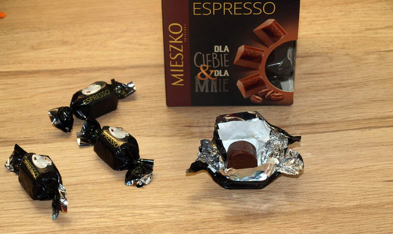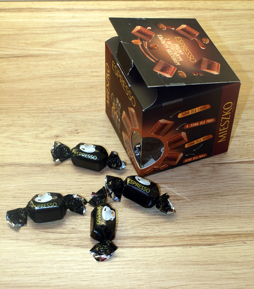 Tego dnia najwyraźniej nie miałam ochoty na słodycze ale los miał inny plan. Stojąc w długiej kolejce do kas, przy której zawsze znajdzie się jeszcze coś do dokupienia, zauważyłam kwadratowe pudełko czekoladek w ciepłych brązowych barwach. Dodatkowy napis Espresso utwierdził mnie w przekonaniu, że w środku musi być moja ulubiona kawa! Skusiłam się na nie również z innego względu. Firma Mieszko jest mi znana (nieznanej nie kupiłabym), uwielbiam np. ich Michaszki. W ten sposób kawowe praliny znalazły nową właścicielkę.