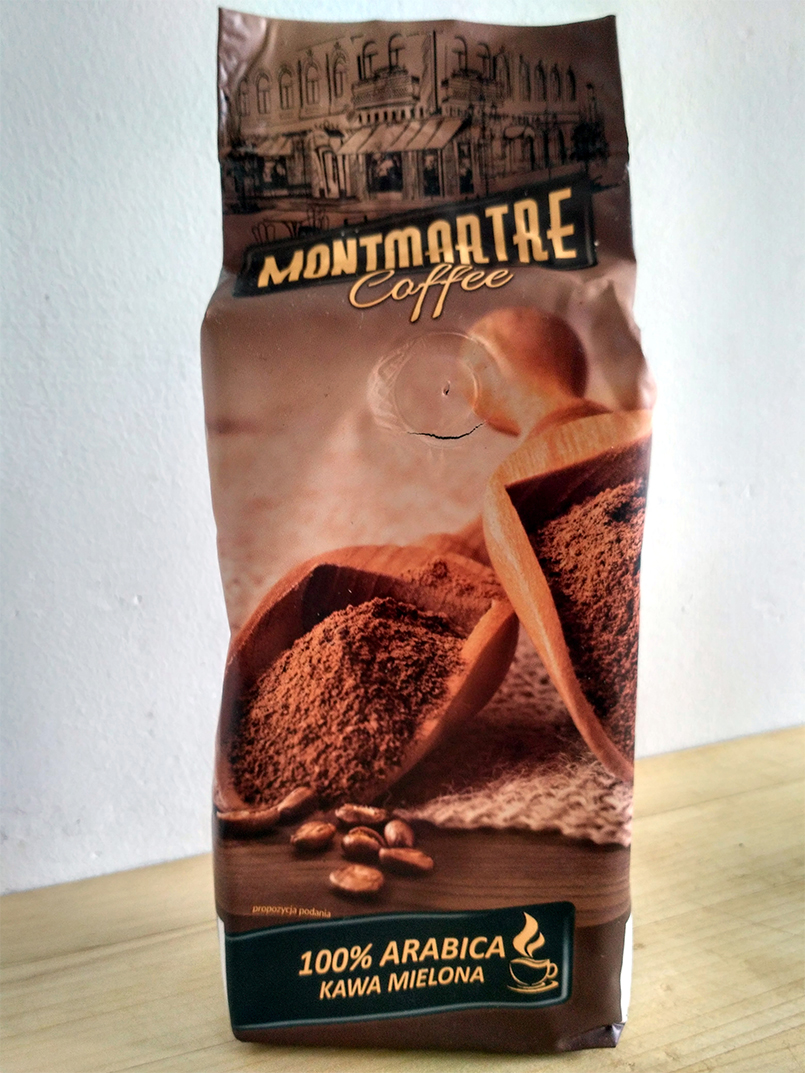 Montmartre Coffee to produkt marki Carrefour, dostępny tylko w tej sieci supermarketów. Wyprodukowany jest przez Cafe Sati Polska. Według informacji producenta, Montmartre Coffee to 100% mieszanki Arabiki, której ziarna pochodzą z Ugandy oraz Etiopii. Kawa nadaje się do parzenia tradycyjnego oraz w ekspresie. Na opakowaniu niestety nie znajdziemy informacji o walorach smakowych i intensywności mieszanki. Przystąpmy zatem do degustacji!