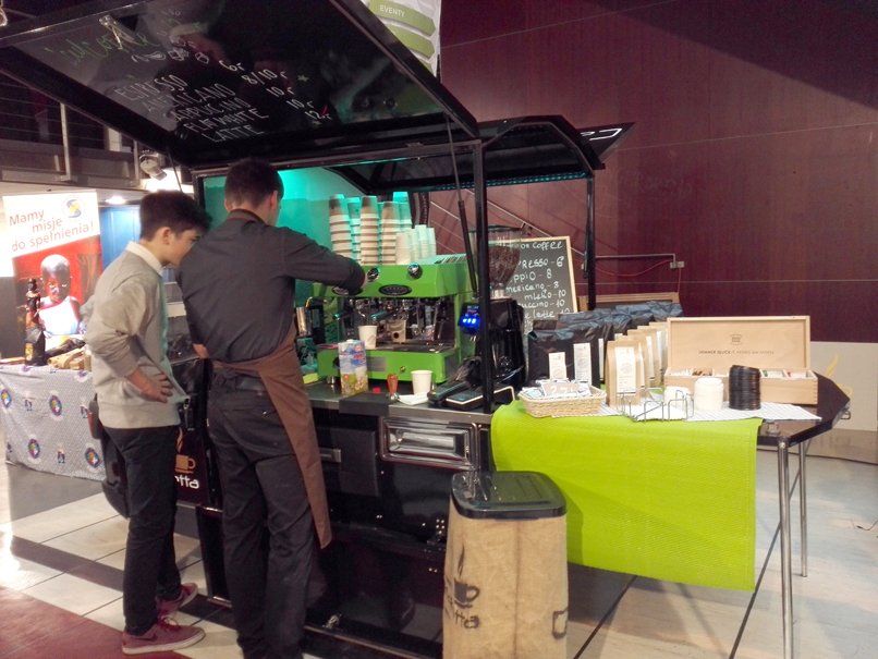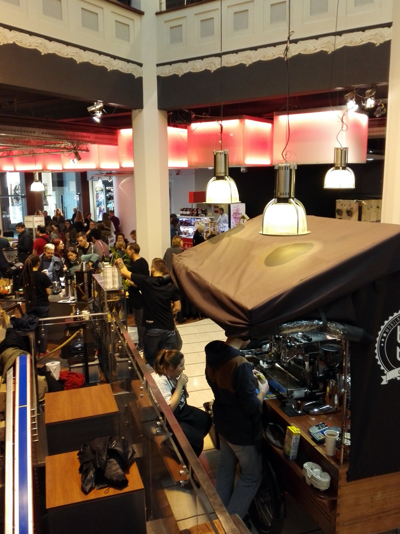 Na scenie odbywały się ciekawe wykłady a spragnieni porannej (lub popołudniowej) kawy mogli wybierać wśród wielu kawiarni oferujących świeżo parzony czarny napar, takich jak ta na zdjęciu powyżej. Pojawiło się także stoisko ze specjalnym mlekiem dla baristów - na piance z takiego mleka można z powodzeniem uprawiać latte art. Zawody na najpiękniejszy wzór również na festiwalu się odbyły, jednak cieszyły się tak dużym zainteresowaniem, że nie byłam w stanie przedrzeć się przez tłum i zrobić zdjęcia.