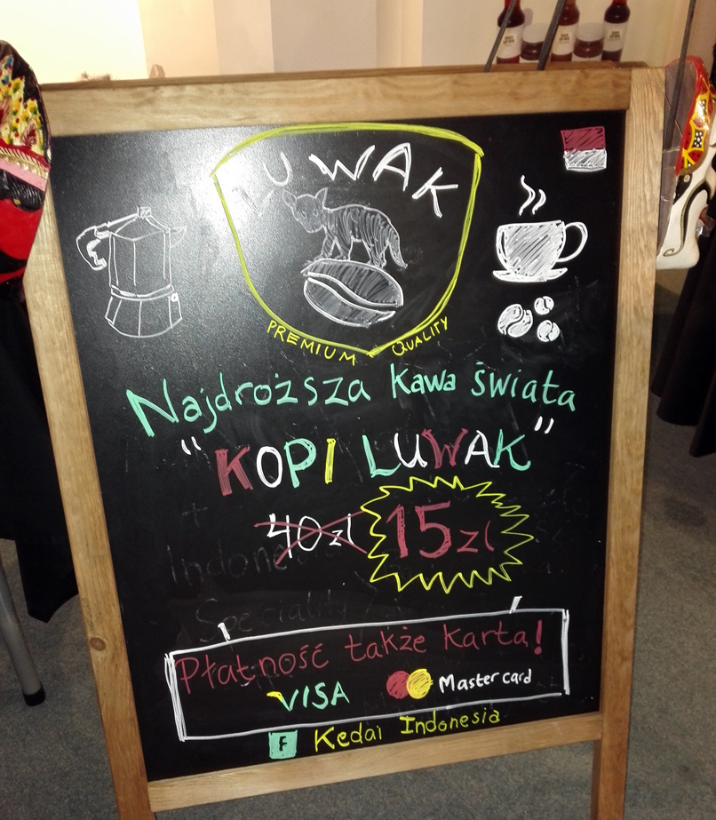 Można było również napić się podobno najdroższej kawy świata Kopi Luwak za jedyne 15 złotych. Pomimo zapewnień, że ziarna nie są oszukiwane, co obecnie często się zdarza w przypadku tej kawy, to jednak ja jej nie spróbowałam - żal mi tych zwierząt hodowanych w klatkach.