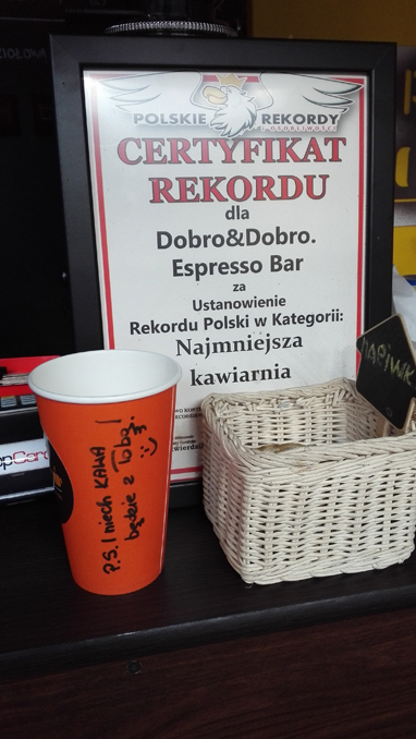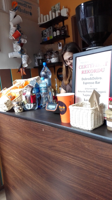 Olega poznałam na ostatnim Warszawskim Festiwalu Kawy i obiecałam, że wpadnę z aparatem do Jego wyjątkowej kawiarenki (tak też uczyniłam i zdaję relację.) A dlaczego wyjątkowej? Bo wpisanej do Księgi Rekordów za niecałe 6 m2 powierzchni, jaką zajmuje. Nawiasem mówiąc, myślę, że kawiarni należy się jeszcze jeden wpis do tej zacnej księgi – za smaki kawy, które powstają w chwilach weny (i eksperymentu) właścicieli :) Piliście kiedykolwiek mrożoną kawę z tonikiem i pomarańczą? No właśnie! Ja piłam i gwarantuję, że oprócz typowych kaw na bazie espresso znajdziecie w Dobro&Dobro prawdziwe kawowe perełki.