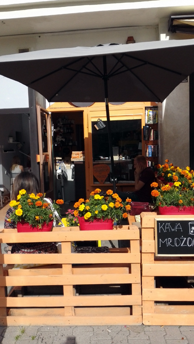 Latem, przed kawiarnią wystawione są siedziska i stoliki (wykonane z palet – duży plus za wkład w ochronę środowiska) i wielki parasol, pod którym można delektować się wybraną kawą obserwując „uliczne” życie warszawiaków.
