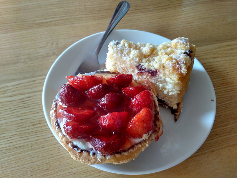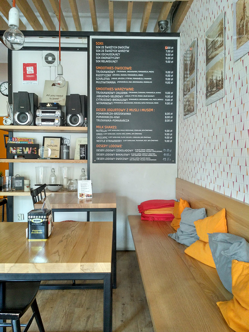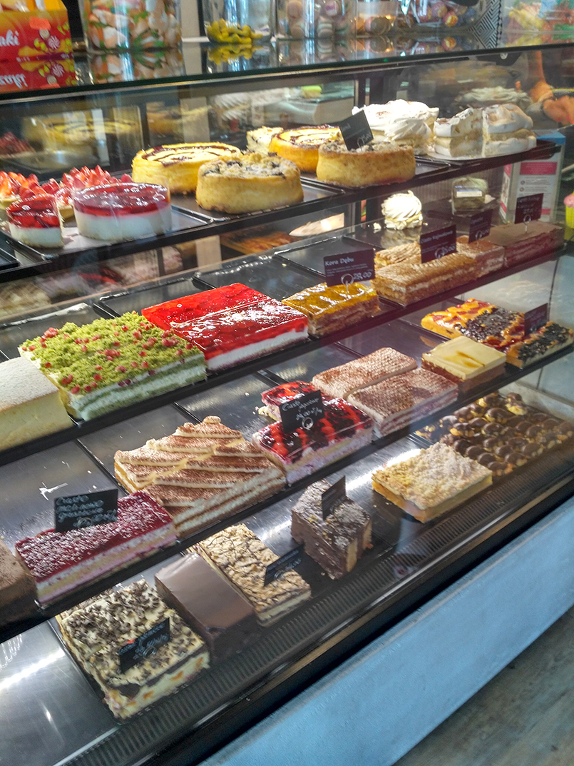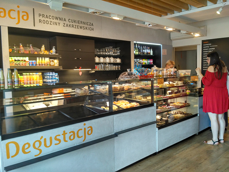 W „Degustacji” zamawiam przy barze, obsługa jest całkiem sprawna i już po kilku chwilach na moim stole pojawia się filiżanka kawy. Wybieram americano z ciepłym mlekiem podanym osobno. Kawa pachnie dobrze, jest dość mocna i intensywna w smaku. Ma w sobie nieco goryczy, więc nie do końca trafia w moje preferencje. Smakuje lepiej po dodaniu mleka i odrobiny cukru. Obudziła mnie i postawiła na nogi błyskawicznie, zanim na stół dotarło ciasto. Skusiłam się także na cappuccino z czekoladą i cynamonem. W kawiarni „Degustacja” jest spory wybór, jeśli jesteś zwolennikiem klasycznych polskich ciast. Znajdziemy tu na pewno kilka wersji sernika, jabłecznika oraz rozmaite ciasta z kremem, babeczki z owocami i budyniem, owocowe ciasta drożdżowe, bezy, keksy, czekoladowe eklerki i podobne pyszności. Będąc w towarzystwie moich dwóch przyjaciółek, zamówiłam trzy porcje ciasta – babeczkę z budyniem i truskawkami, sernik z kruszonką oraz „przekładaniec” z orzechami, galaretką i kremem czekoladowym. W naszej prywatnej klasyfikacji wygrał sernik – był puszysty, delikatny i rozpływał się w ustach. Ciasto z orzechami także było świetne, a jego porcja bardzo obfita. Babeczka z budyniem była dość klasyczna, ale także dobra i świeża. O tym, że ciasta są tu po prostu dobre świadczy także to, że podczas mojej wizyty kawiarnię odwiedziło sporo osób tylko po ciasta i torty. Cukiernia „Degustacja” oferuje wszystkie swoje wyroby także na zamówienie. Oprócz słodkości w menu znajdziemy także soki ze świeżych owoców i warzyw, owocowe smoothie, desery jogurtowe z muesli i musem owocowym, słodkie czekoladowe shaki oraz bogate lodowe desery. Jeśli lubisz niskokaloryczne i zdrowe koktajle, „Degustacja” ma je także w ofercie, np. z jarmużem, burakiem, szpinakiem czy rukolą. Jak na małą kawiarnię w spokojnym miasteczku oferta jest naprawdę bogata i urozmaicona. Ceny są w porządku w stosunku do jakości produktów – obfita porcja ciasta kosztuje dosłownie kilka złotych, a cena kawy plasuje się poniżej 10 zł. Owocowe koktajle i musy to koszt około 9 zł. Stosunkowo najdroższe są owocowe desery – 15 do 17 zł.